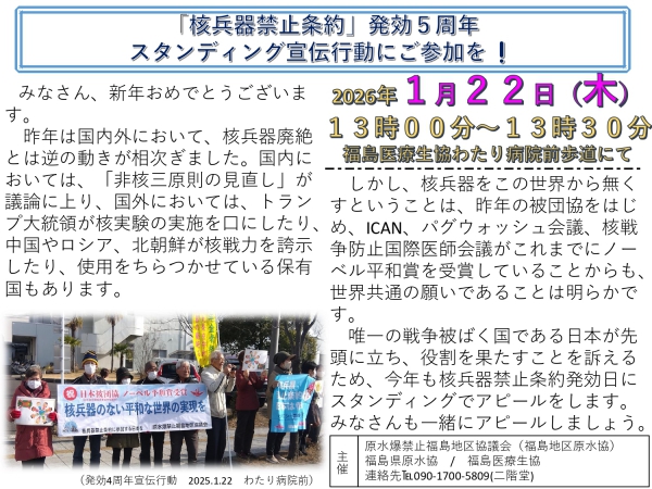 核兵器禁止条約が発効してから5周年を迎えた2026年1月22日、わたり病院前歩道にてスタンディング行…