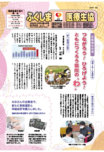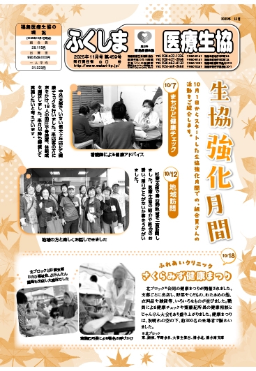 機関紙「ふくしま医療生協」とは、福島医療生協が定期発行している新聞です。年9回発行しています。医療生協の方針や事業活動、組合員の活動、健康についての情報などを発信しています。