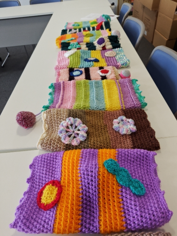 すでに100個を超えるマフを制作し、わたり病院をはじめ、サービス付き高齢者向け住宅ひだまり、わたり福祉会などに寄付し、患者さんや利用者さんに使用していただいています。