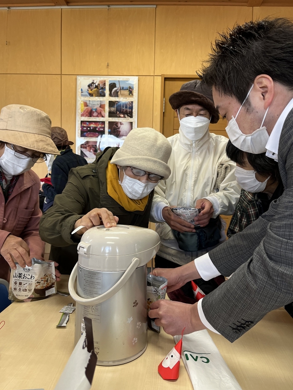 もちずり観音に着いてからは、おにぎりやおかしの防災食を試食しました。