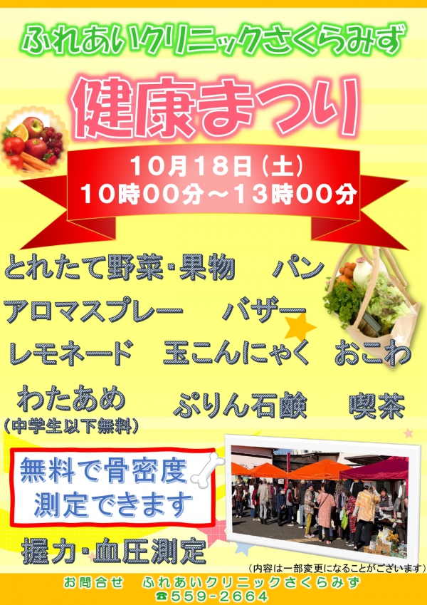 ふれあいクリニックさくらみずで 健康祭りを開催します。 骨密度測定や体組成測定、 新鮮野菜の販売な…
